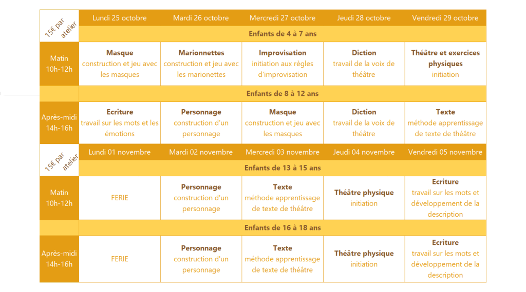 Pour initier vos enfants au théâtre et/ou à l’écriture, des stages sont organisés pendant les vacances de la Toussaint par Les Ateliers Artis !